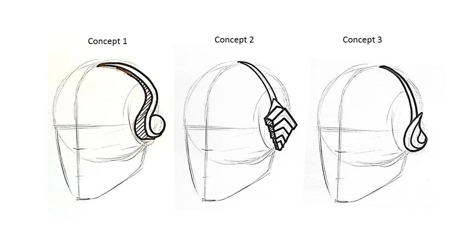 Uit de schetsen heb ik met Koen 3 concepten uitgezocht. Vormgeving met Koen overlegt, dat de koptelefoon vooral ronde vormen moet hebben. Concept 2 zou het mooiste zijn, maar moet meer een rondere/organische vorm krijgen. De hoofdband zou ik maken door middel van kerfbending.